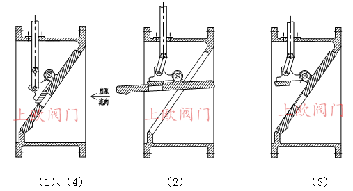 1、開閥:初始狀態如(1)示,當水泵啟動,水壓通過進口帶微孔止回閥的旁通管,進入控制腔下腔,大閥板在進口端水力作用下,連同小閥板一同緩慢開啟,如圖(2)示。開閥速度可根據工況要求調節旁逋球閥的開度進行設定,以達到最佳效果為準。