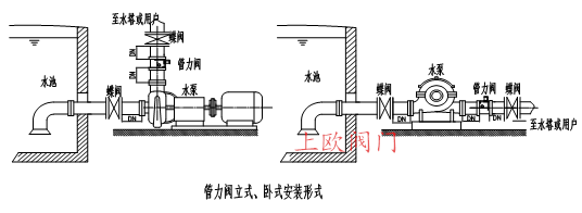 1、管力閥可采用臥式與立式安裝(介質流向向上),有控制缸頂桿側為出口方向,嚴禁反裝,必須保證閥軸一定在水平位置。