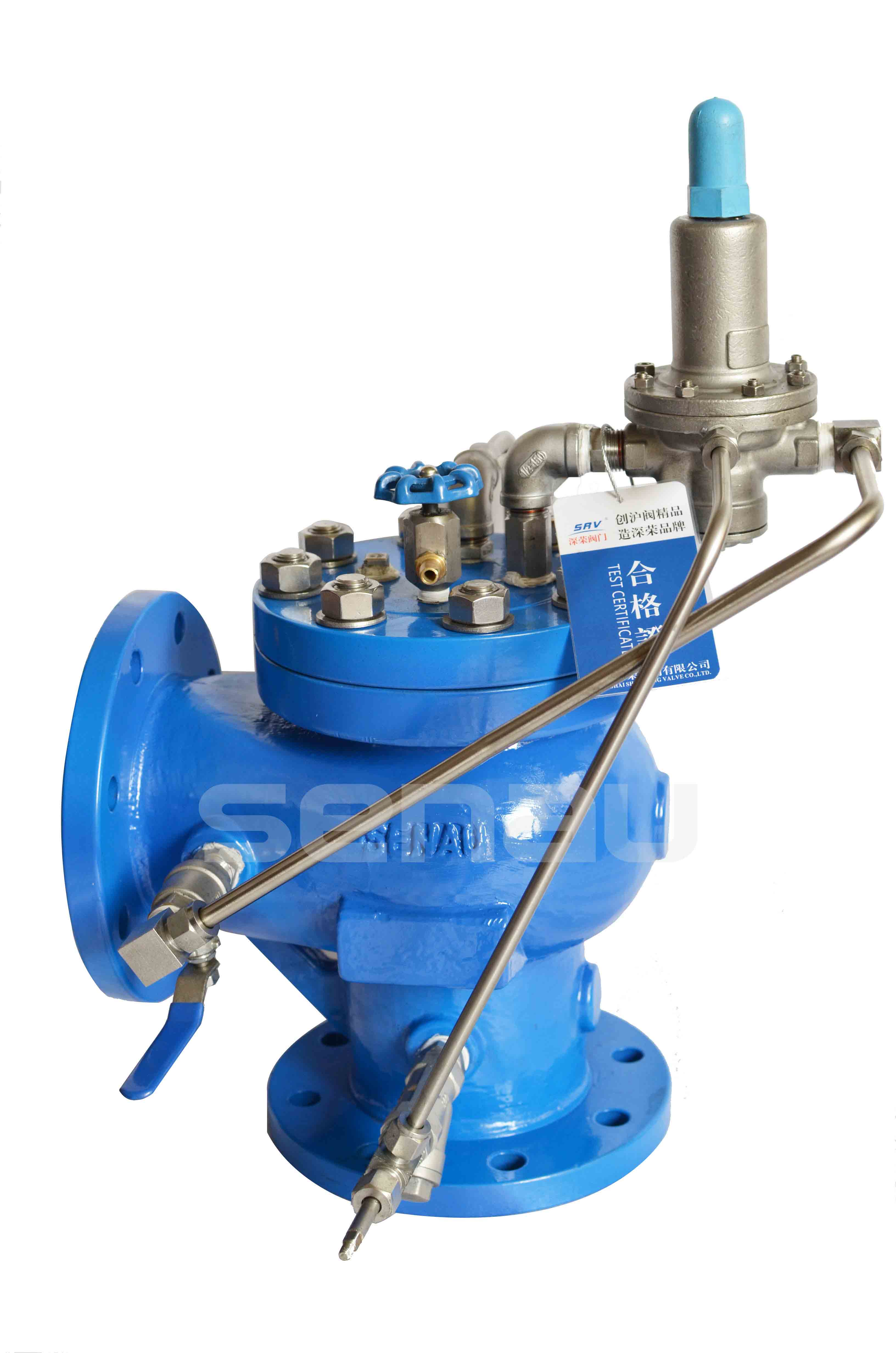 EG5001/GA6600/GA6700水擊預防閥,水擊泄放閥主要由主閥、高壓水力導閥、導管等零件組成。具有水力自動控制、高壓無條件開啟泄除水錘的功能。該閥操作平衡無振動,具有獨一無二的V型開口閥瓣和差動活塞設計,在任何工作壓力下都能給與可靠的關閉推動力,調節性能優秀,運行平穩,不會產生自身關閉水錘,大孔道高敏感的泄壓導閥響應過壓條件快速開啟主閥(水擊泄放閥),當壓力平息后可快速關閥。